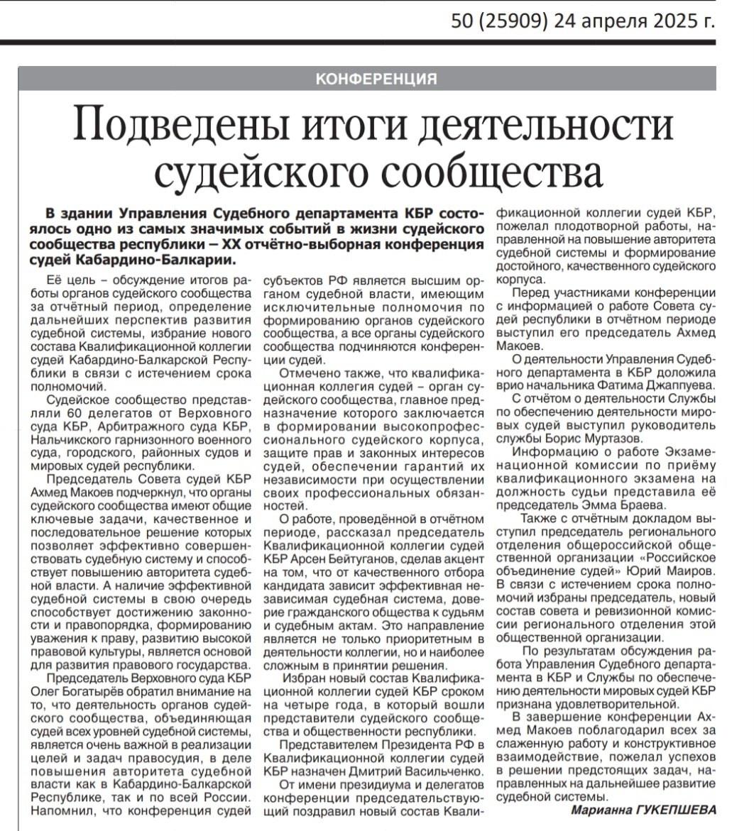 | Газета "Кабардино-Балкарская правда" опубликовала статью, посвященную прошедшей XX Конференции судей Кабардино-Балкарской Республики | версия для печати |