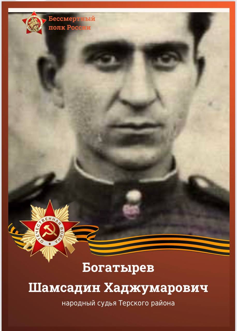 Богатырев Шамсадин Хаджумарович – родился в 1914 году в с. Нижний Курп Терского района Кабардино-Балкарской АССР. В 1941 г. был призван на военную службу Терского РВК, Кабардинская АССР. Сражался в 20 стрелковом корпусе, 146 гвардейском стрелковом полку, 48 гвардейской стрелковой дивизии, 899 отдельном саперном батальоне. Окончил службу в звании «гвардии лейтенант». За свой вклад в Великую Победу Богатырев Ш.Х. был награжден орденами Красной Звезды и Отечественной войны II степени, а так же медалями «За победу над Германией в Великой Отечественной войне 1941–1945 гг.», «За взятие Берлина», «За оборону Кавказа», «За взятие Кенигсберга». После окончания войны Богатырев Ш.Х. возвратился на родину, и в 1947-1948 гг. работал народным судьей Терского района. В 1950 г. работал оперуполномоченным Терского РО МГБ.